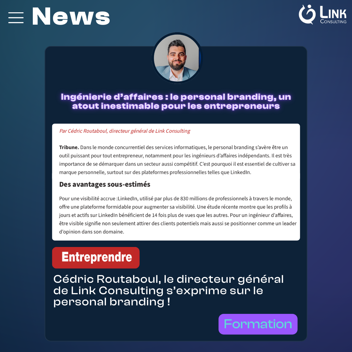 Nous sommes ravis de vous annoncer la parution d'un nouvel article de Cédric Routaboul, directeur général de Link Consulting, sur le Journal Entreprendre. Dans cet article intitulé "Ingénierie d'affaires & Personal Branding : Un atout inestimable pour les entrepreneurs", Cédric explore l'importance cruciale du personal branding pour les ingénieurs d'affaires indépendants.