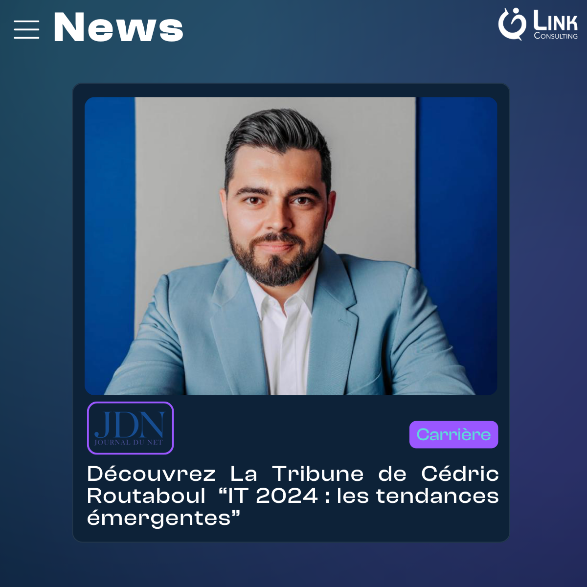Nous sommes enthousiastes de partager avec vous notre dernière réalisation : une tribune publiée dans le Journal du Net intitulée "IT 2024 : les tendances émergentes". Cette publication marque une étape importante pour Link Consulting, car elle met en lumière notre expertise et notre vision prospective dans le domaine de la technologie.