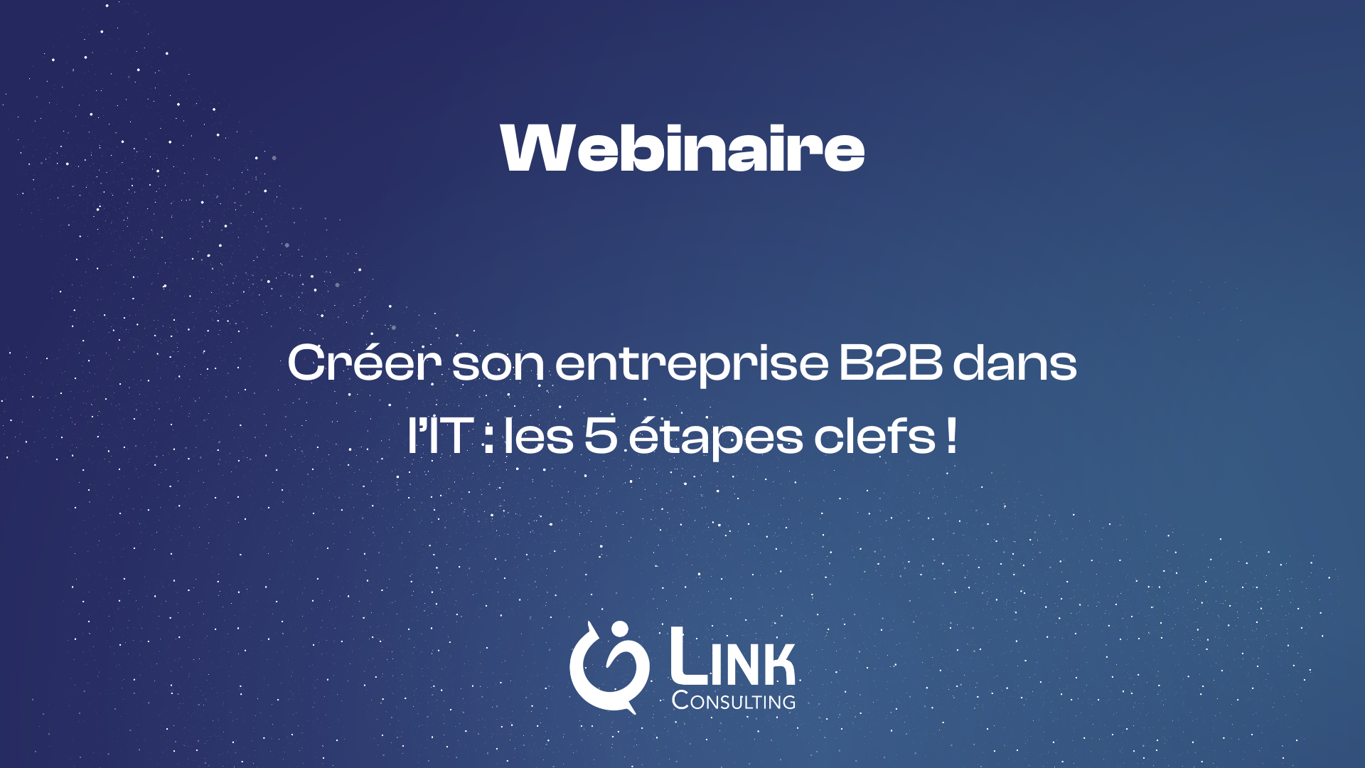 Retrouvez nous, le 23 janvier à 14h, pour le premier webinaire de l'année, animé par Cédric Routaboul, le directeur général du réseau Link Consulting. Durant cette heure, il vous donnera 5 étapes clefs dans la création de son entreprise B2B dans l'IT !